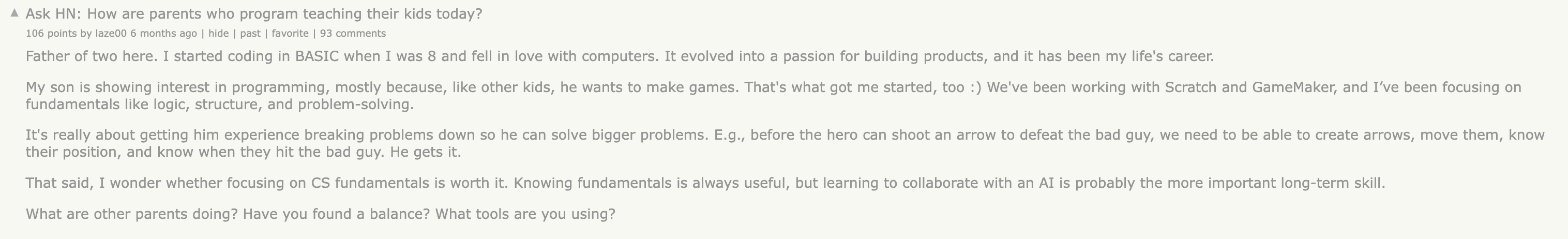 1. Ask HN- How Are Parents Who Program Teaching Their Kids Today?